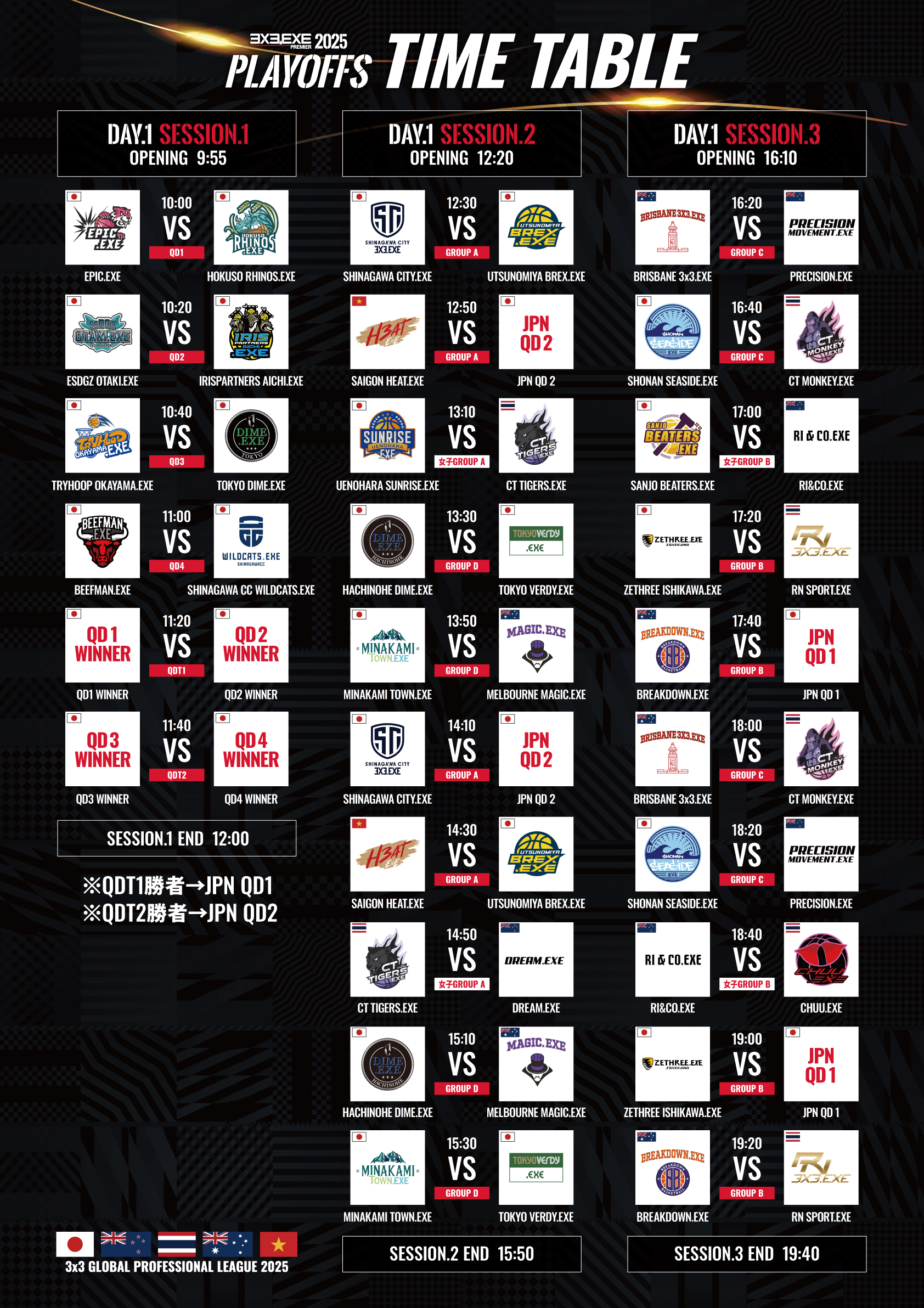 『3x3.EXE PREMIER 2025 PLAYOFFS』は、日本・タイ・ニュージーランド・オーストラリア・ベトナムから、レギュラーシーズンの上位チームのみが参加できる大会。 男子24チーム、女子6チームが出場し、2日間にわたって試合を行います。2日目の決勝トーナメントで優勝したチームが年間総合優勝となる、今シーズンの最終決戦です。