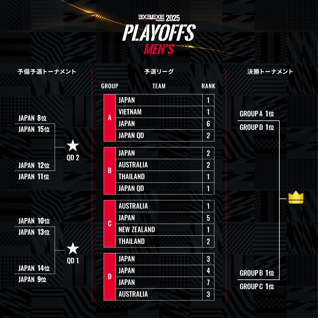 『3x3.EXE PREMIER 2024 PLAYOFFS』は、日本・タイ・ニュージーランド・オーストラリア・ベトナムから、レギュラーシーズンの上位チームのみが参加できる大会です。 男子24チーム、女子6チームが出場し、2日間にわたるトーナメント戦を実施し、出場国5ヵ国による年間チャンピオンを決める国際大会です。
