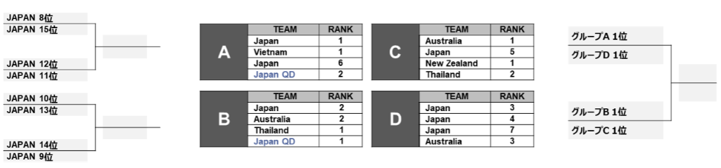 日本は15チーム(※)、タイ2チーム、ニュージーランド1チーム、オーストラリア3チーム、ベトナム1チームが出場。各国のトップチームが一堂に会し、1日目はグループリーグ、2日目はグループリーグ+決勝トーナメントを実施。