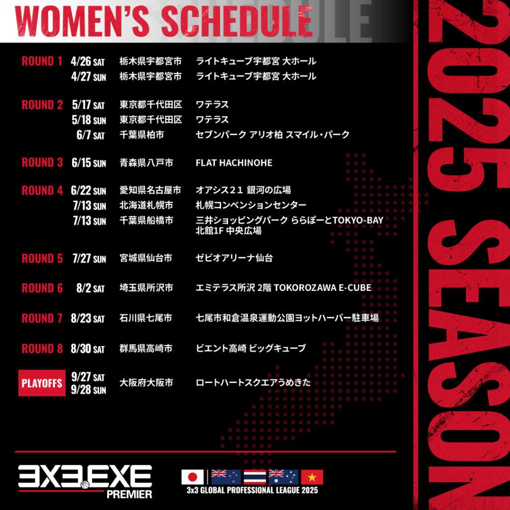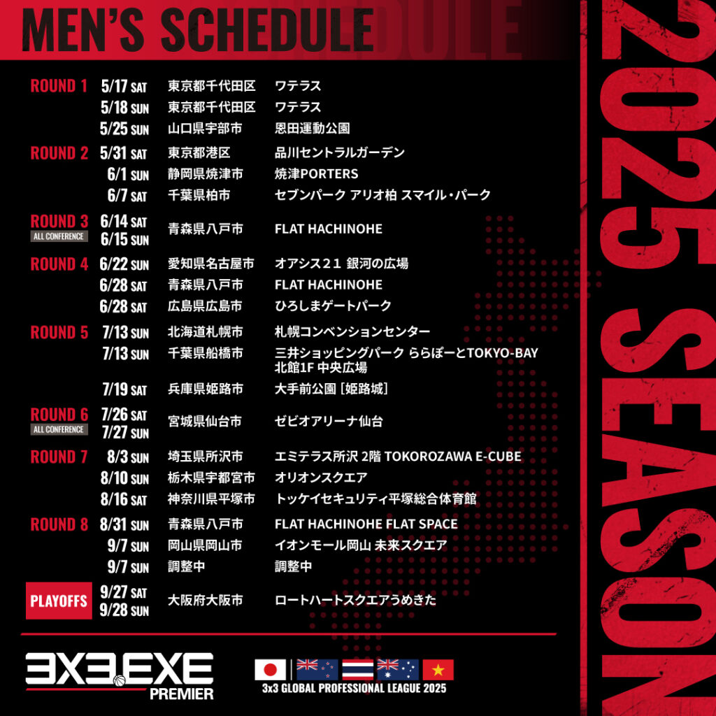 また、PLAYOFFSの「グラングリーン大阪 ロートハートスクエアうめきた」に加え、未定となっていた「3x3.EXE PREMIER 2025 JAPAN」の会場についても以下2会場が決定致しておりますため、併せてお知らせ致します。