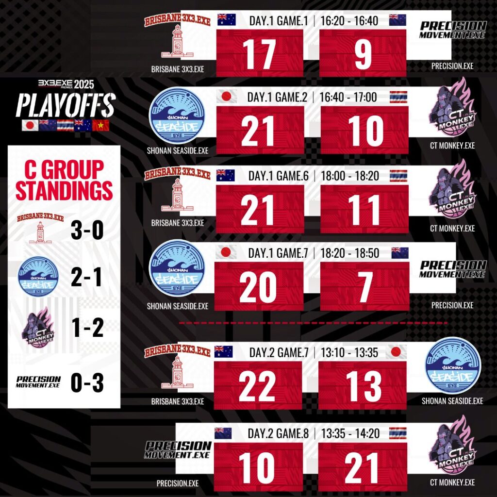昨年BRISBANE CITY BLUE.EXEで出場したメンバーがそのままBRISBANE 3X3.EXEへ移籍し構成されたチーム。昨年はPLAYOFFSでBEST4。3x3.EXE SUPER PREMIERにも出場したが結果を出すことはできなかった。リベンジを果たすべく挑んできた彼らは、そもそも個々の能力が高いことに加え、3x3を同じメンバーで2年経験してきたことから、連携も著しく向上した完成度の高いチームとして戻ってきた。MVPのカイを中心としたゲームメイクで外からも中からも得点を重ね、見事リベンジ達成。オーストラリア初優勝を飾った。